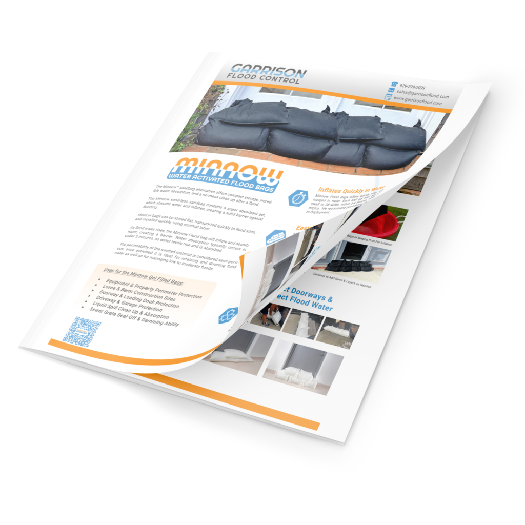 The secret to the sandless Minnow flood bag is its non-woven outer construction, filled with a hydrophilic SAP (Super Absorbent Polymer), capable of absorbing 39-44 lbs of water. Once inflated, bags provide resistance to rising and flowing water, similar to traditional sand bags.